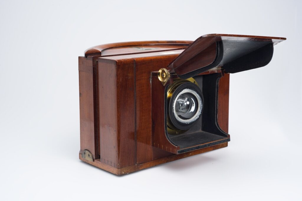 Thomas Sutton patented the first panoramic camera in 1859. It had a 76 mm lens protected by a hinged wooden flap. The curved wooden back was designed to take curved glass wet-plate negatives. Panoramic photographs were produced by the large curved plate coupled with the wide angled lens.